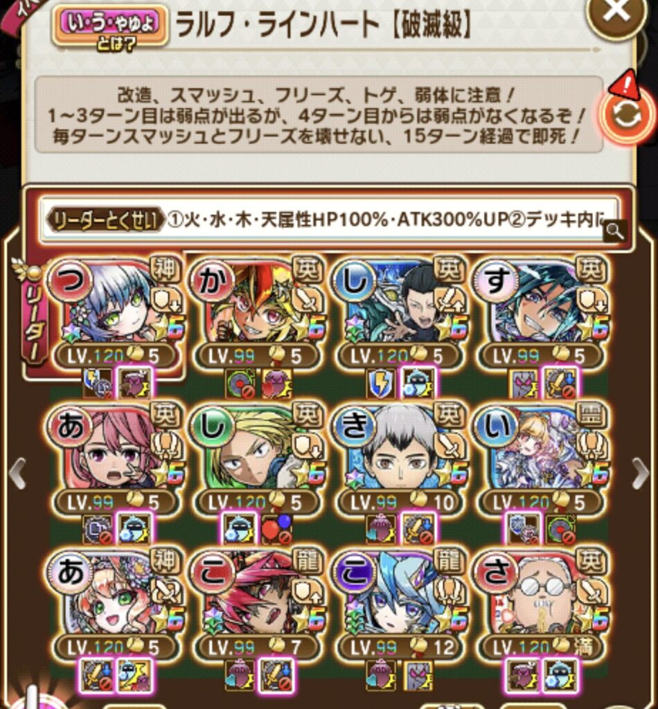 【コトダマン】ラルフ・ラインハート【破滅級】に挑んだ話(テニスの王子様コラボ) コトダマン 2025.04.28 最初から弱点出ていて冥属性に有利な属性ならどれでもボム条件と非常に懐の広いクエストですね 天と何かの属性の改造耐性持ちを探して↑のキャラをリーダーにして初クリアをしましたが「しかいしんこう」でゴリ押しできるのでは?と思い 2回目以降は↑のデッキで周回中です時間が経つにつれコラボクエストの破滅級にコラボキャラがいなくても何とかなる調整にしてくれてありがたいことです閲覧ありがとうございました
