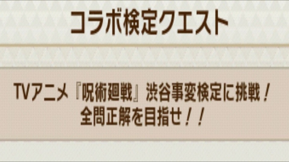 【コトダマン】(ネタバレ)呪術廻戦コラボ第三弾(渋谷事変)検定クエスト解答 コトダマン 2025.07.312025.08.29 ①しぶやじへん②ごくもんきょう③与幸吉は~~『究極(アルティメット)「めかまる」』④くぎさきのばら⑤ちょうそう⑥東堂葵が~~術式「ぶぎうぎ」⑦しんかげりゅう⑧ふくまみづし⑨むいてんぺん⑩らっかのじょう