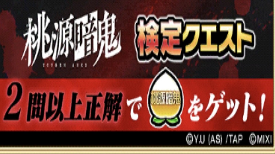 【コトダマン】(ネタバレ)TVアニメ『桃源暗鬼』検定クエスト解答 コトダマン 2025.09.24 ①けっしょく②おいらんざか③ももたろう④びょうぶがうら⑤一ノ瀬四季を審査する~~四季は「しゃてい」⑥らせつがくえん⑦しかいらんぶ⑧桃太郎機関所属の『桃宮「つばきり」』⑨鬼機関で利用されている~~通称「むっくん」⑩うかてんせい