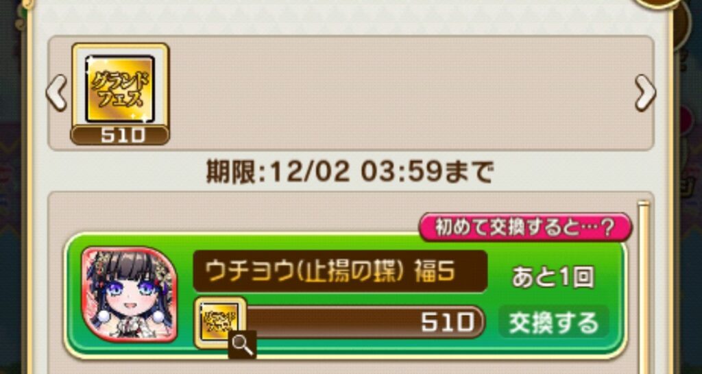 天井交換からの交換特典(?)のワンモア召喚でシヨウチヨウ(グランド)1凸(画像無し)
