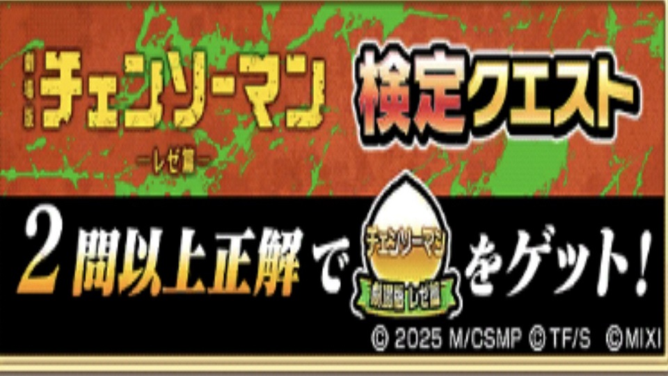 【コトダマン】(ネタバレ)チェンソーマンコラボ第二弾(劇場版『チェンソーマン レゼ篇』)検定クエスト解答 コトダマン 2025.10.242025.11.22 ①ひがしやま②てんしのあくま③ちぇんそおさま④えいがかん⑤さめのまじん⑥ぼむがある⑦血を飲み過ぎたパワーは~~『「ごうまん」な悪魔』⑧レゼの働く喫茶店で~~「どぶあじ」⑨ボムと戦うチェンソーマン。「ちぇえん」を~~⑩デンジとレゼは雨の中の~~「ふたみち」